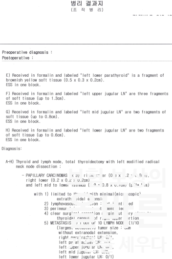 피보험자는 대학병원에서 갑상선암과 림프절 전이가 확인되어 수술하였고
